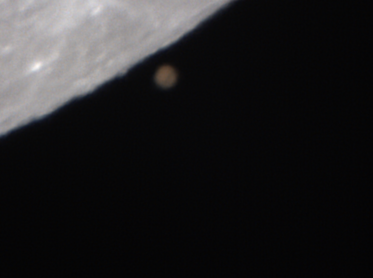 | Description | Occultation de Mars par la Lune, gachée par des nuages très denses. J'ai quand même réussi à en tirer cette image sur laquelle on distingue les deux astres. |